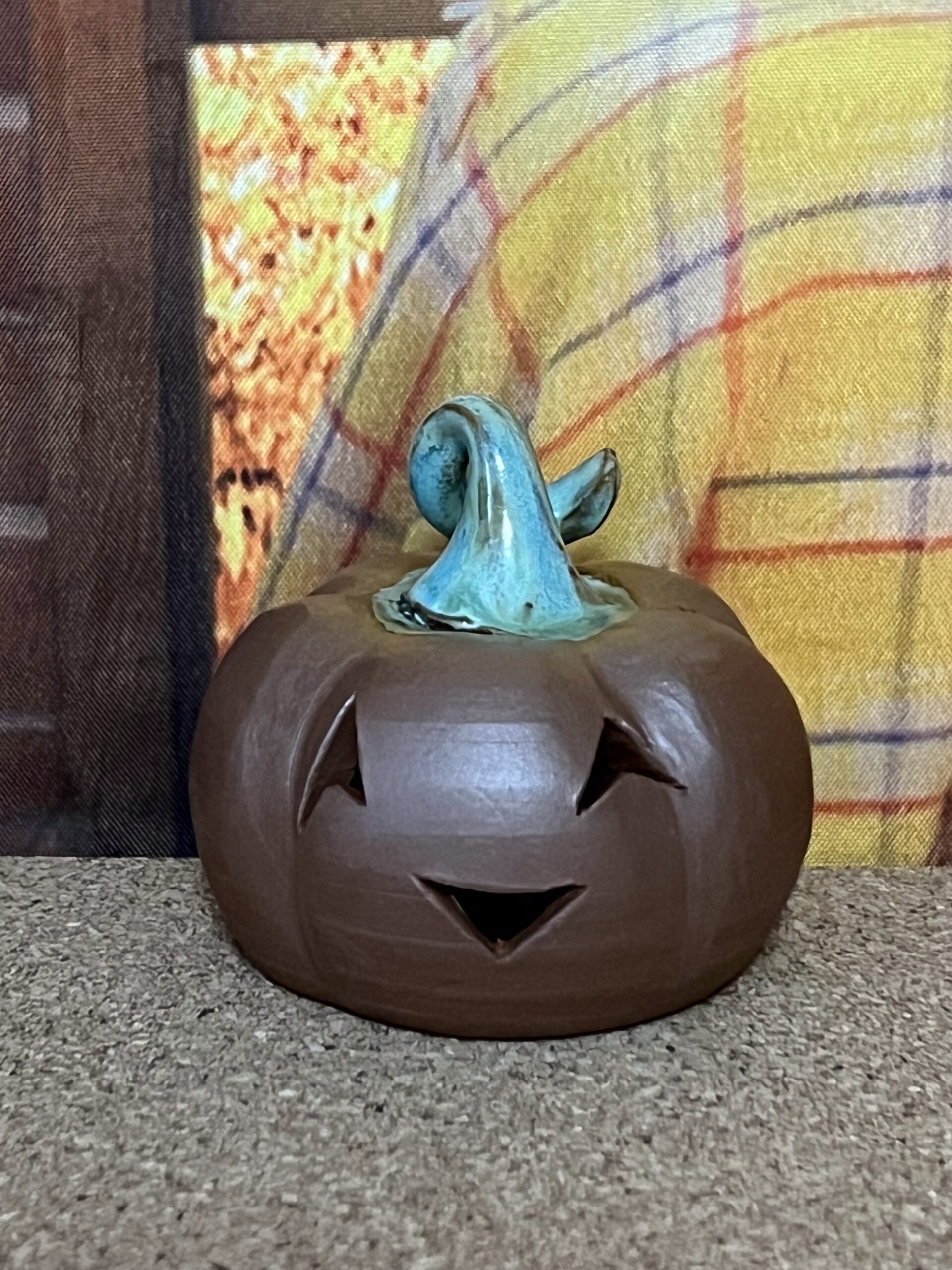 A cute little red ware jack-o-lantern to decorate with every year in celebration of Halloween. This one is decorated with pale green glaze around the stem.