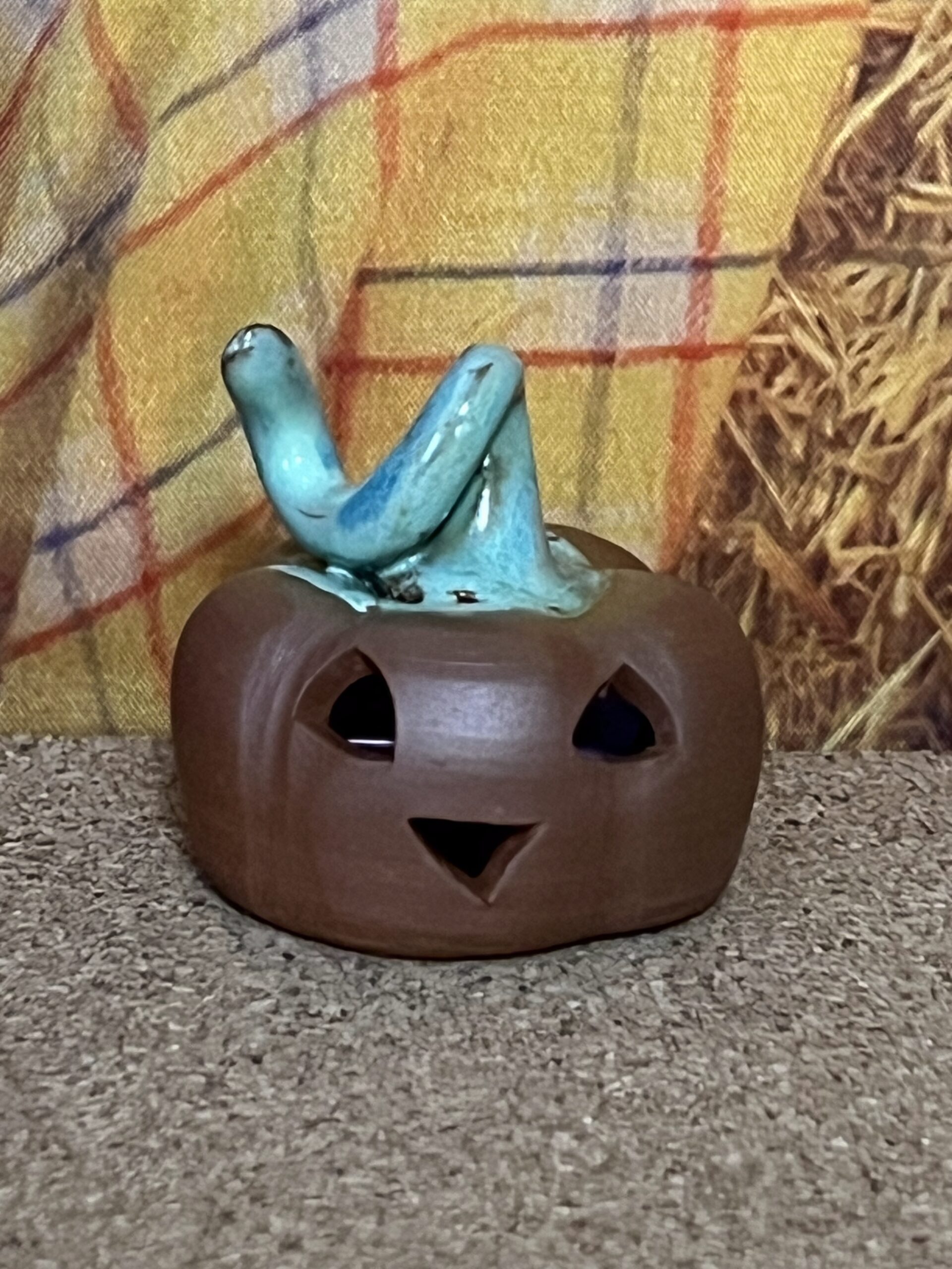 A cute little red ware jack-o-lantern to decorate with every year in celebration of Halloween. This one is decorated with pale green glaze around the stem.