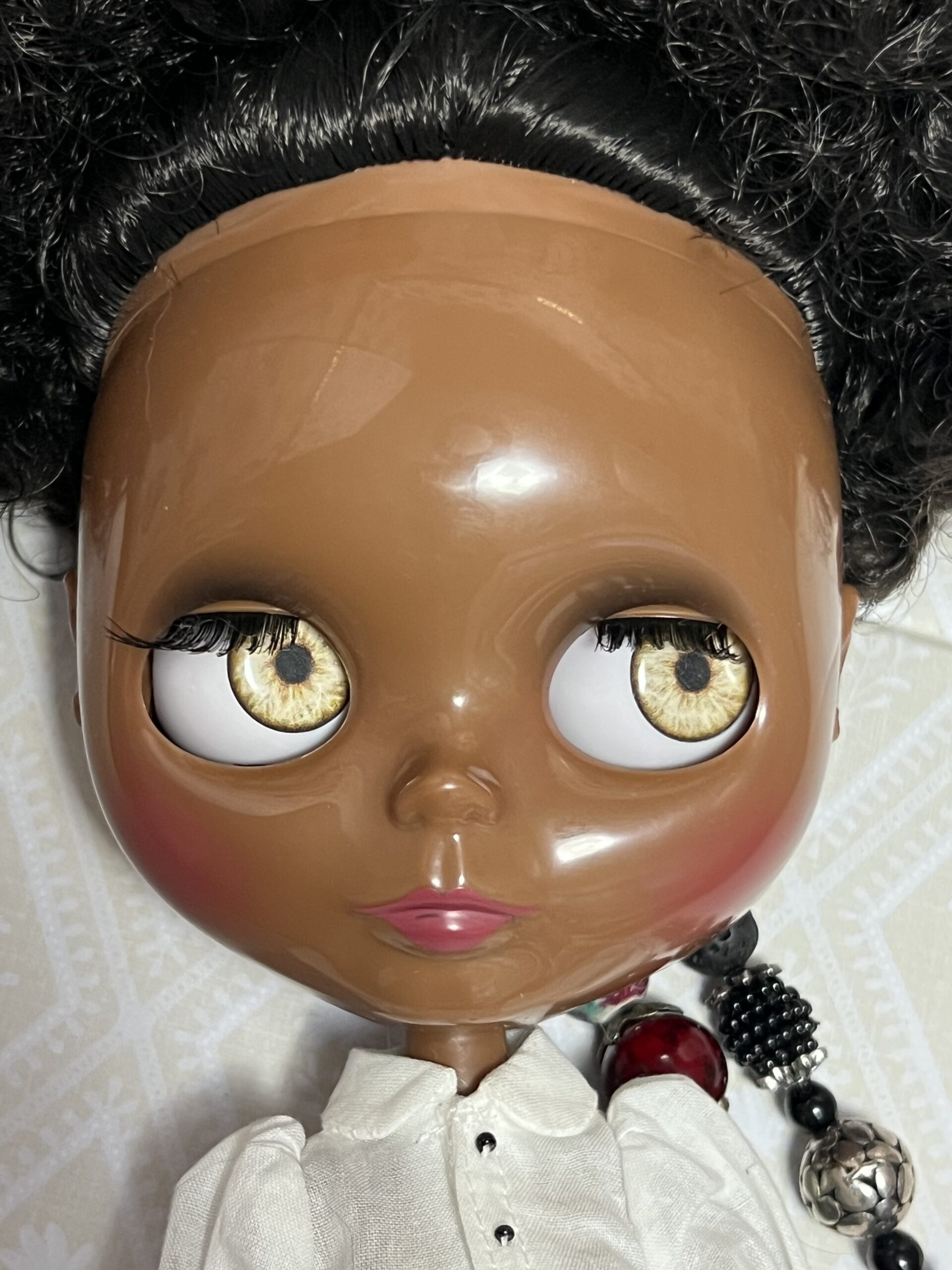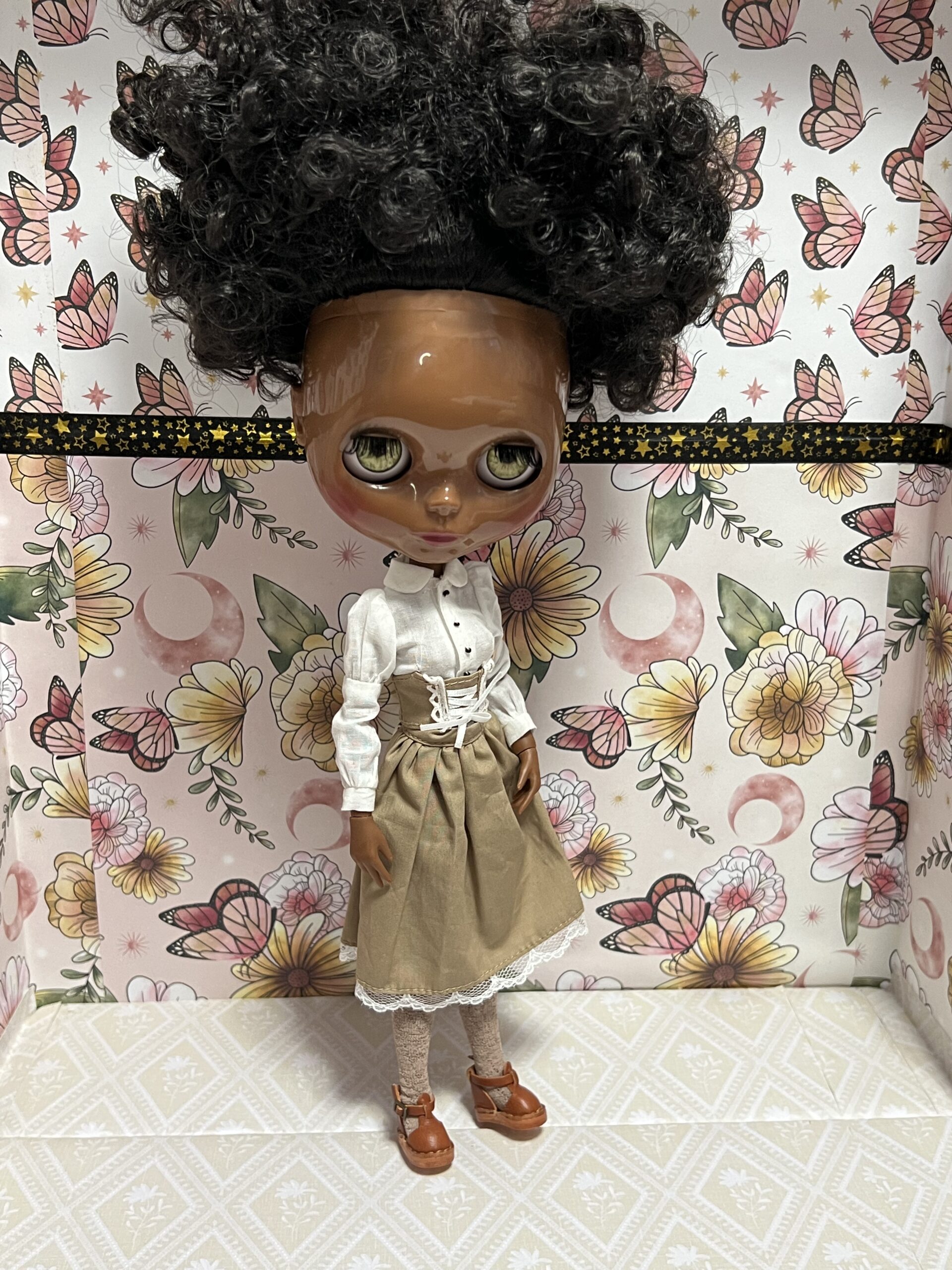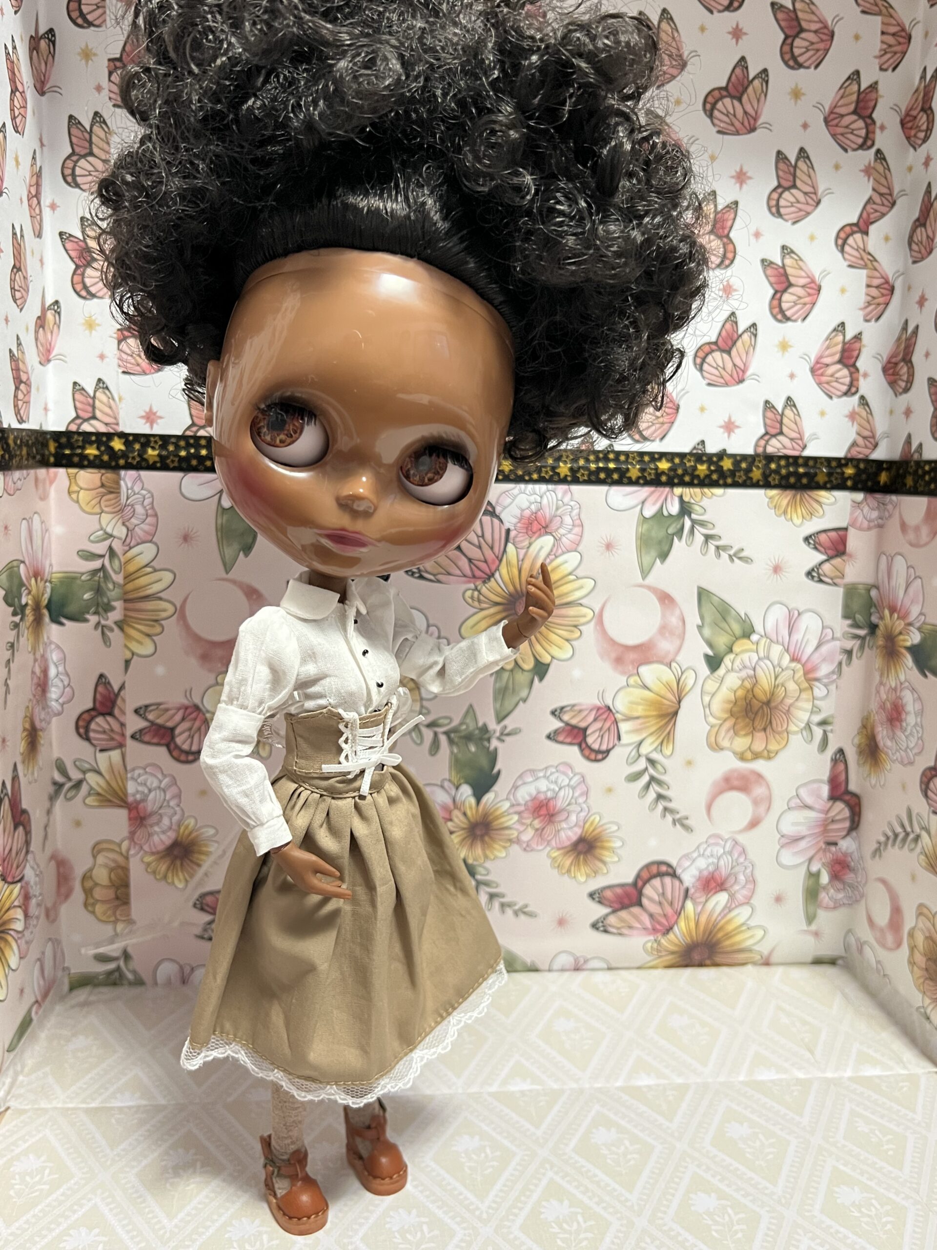 Lightly customized factory Blythe doll. I have given her new eye chips with gaze correction and expanded the movement of her head. She also has custom strings by Heather of Primrose and Madge on Etsy. She comes with extra hands and dressed as you see her here.