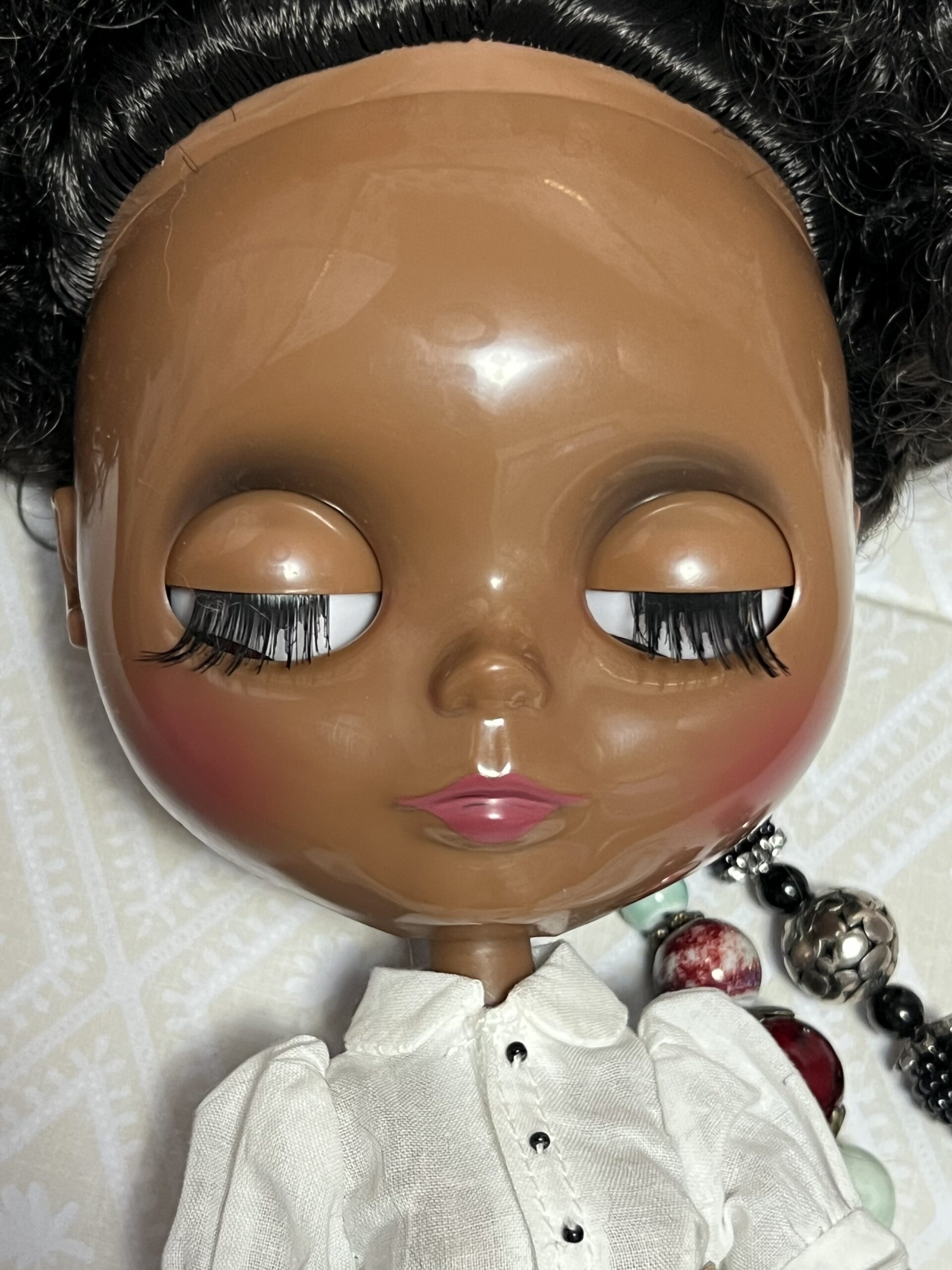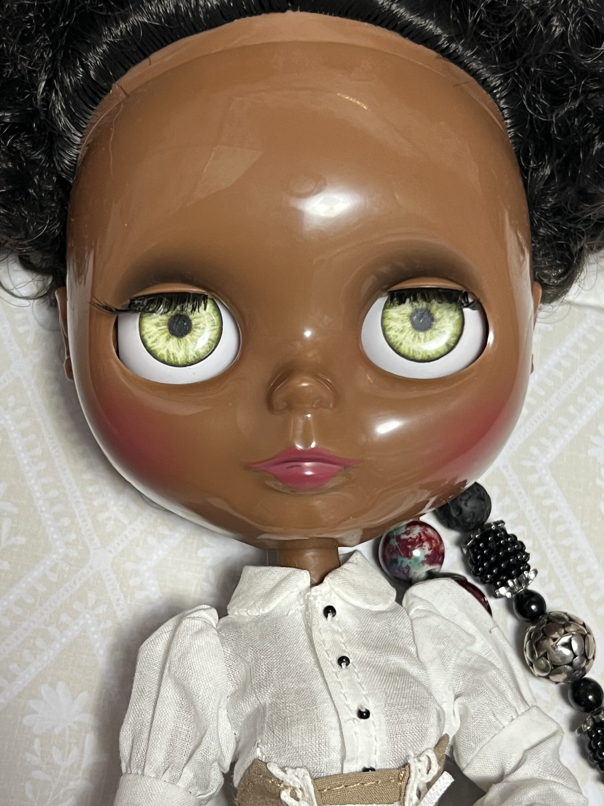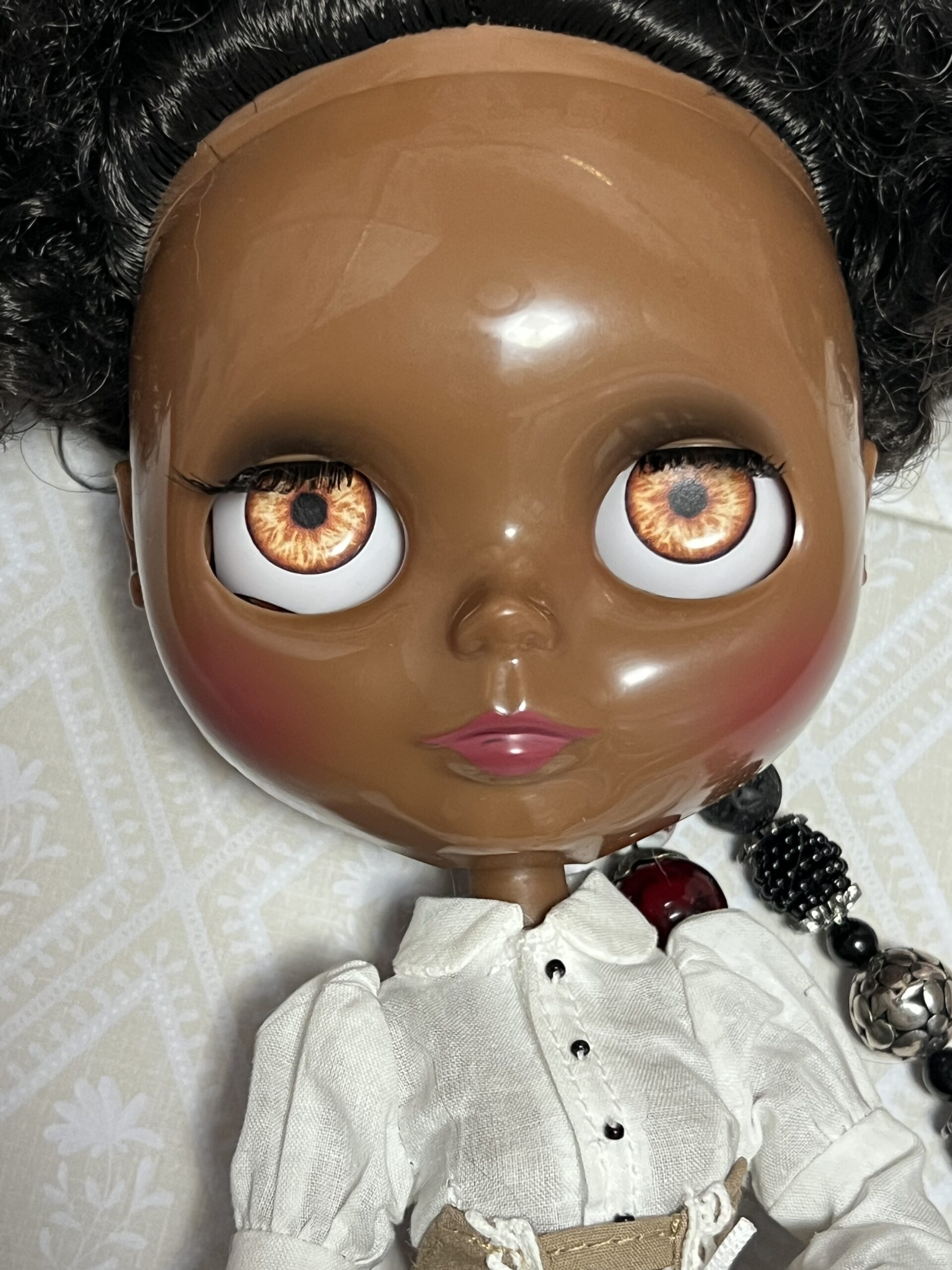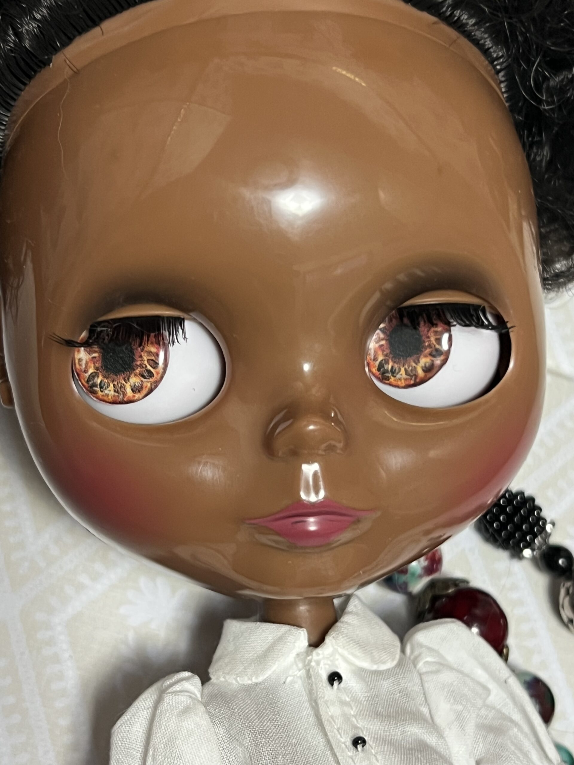 Lightly customized factory Blythe doll. I have given her new eye chips with gaze correction and expanded the movement of her head. She also has custom strings by Heather of Primrose and Madge on Etsy. She comes with extra hands and dressed as you see her here.